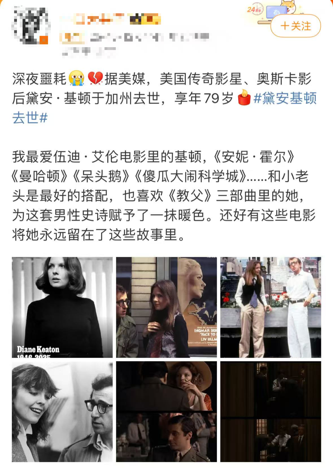 美国著名女演员戴安·基顿,于当地时间10月11日在加州离世,享年79岁。