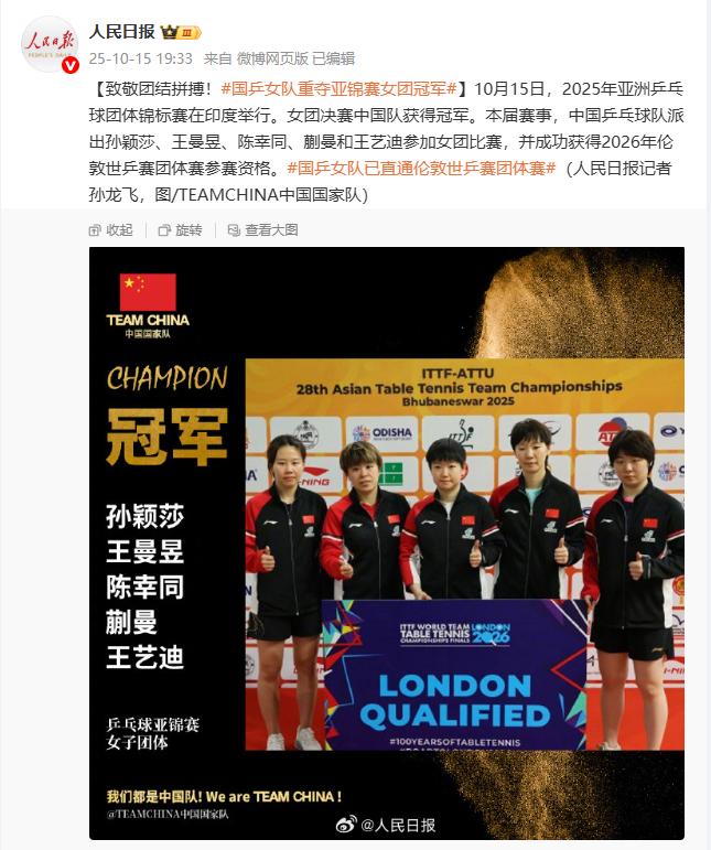 “2025年亚锦赛女团决赛中国队获得冠军,并成功获得2026年伦敦世乒赛团体赛参赛资格。”短短一句话,背后是惊心动魄的巅峰对决,是孙颖莎、王曼昱等年轻选手的热血冲锋,更是国乒用实力打破质疑的霸气宣言。